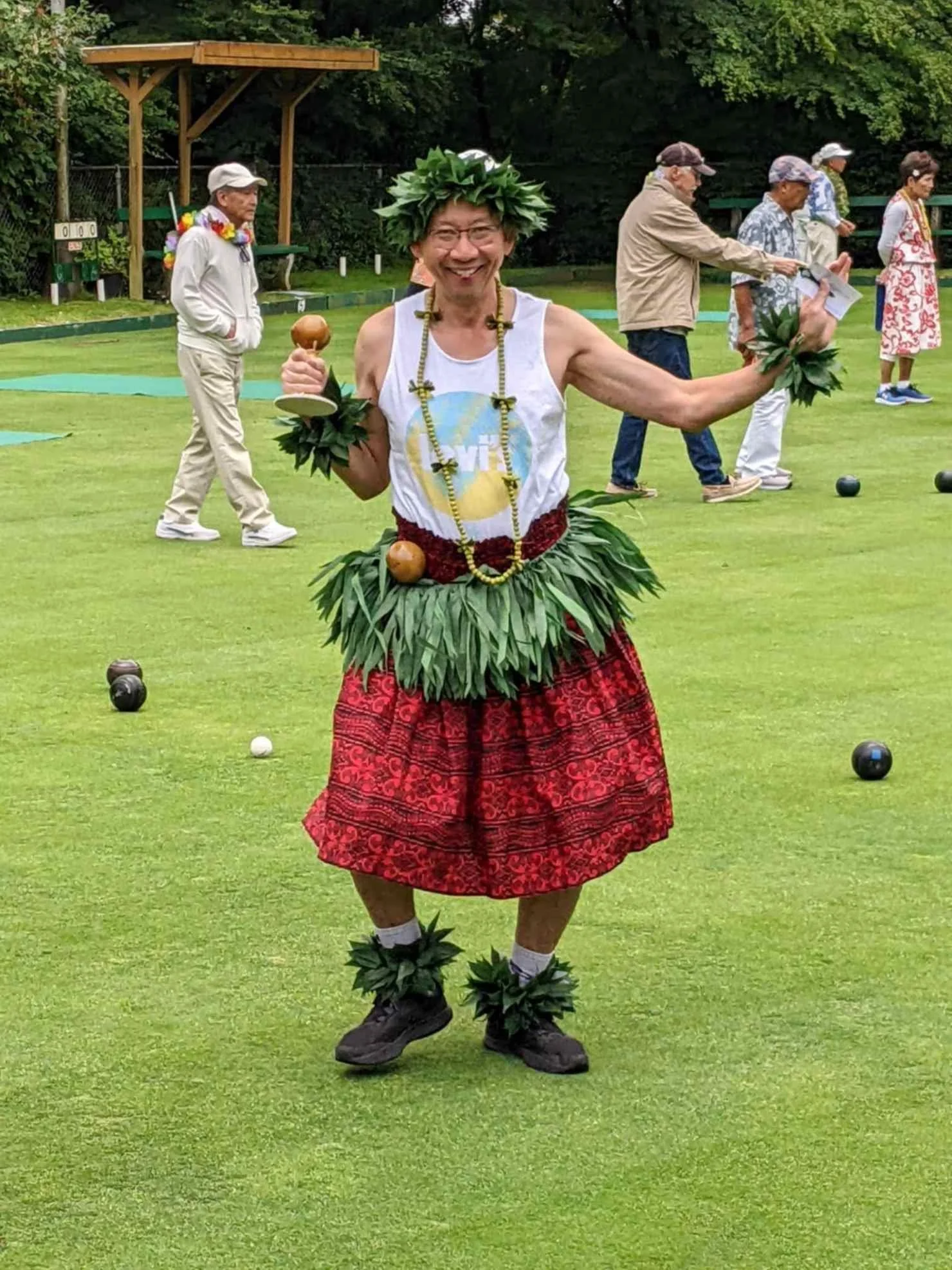 Our 3rd annual Hula Bowl took place on a Saturday. The origins of the day became a reality because of our fellow bowler Betty-Ann, for her love of the Hawaiian Islands and the game of lawn bowling. The weather that morning started off dreary with showers and grey skies, but Mother Nature stepped in and parted the clouds with her magical hand, enough to show us all some rays of sunlight in the early afternoon.